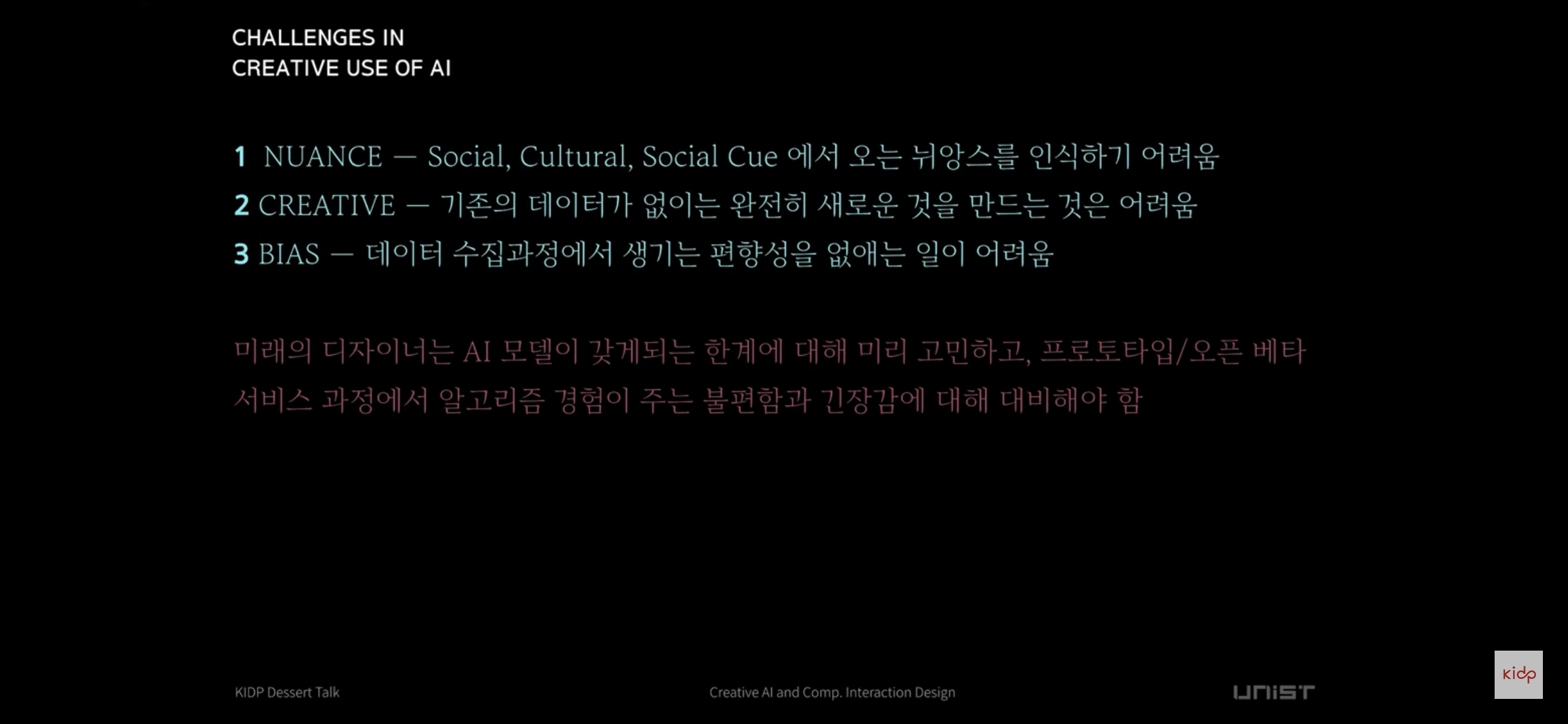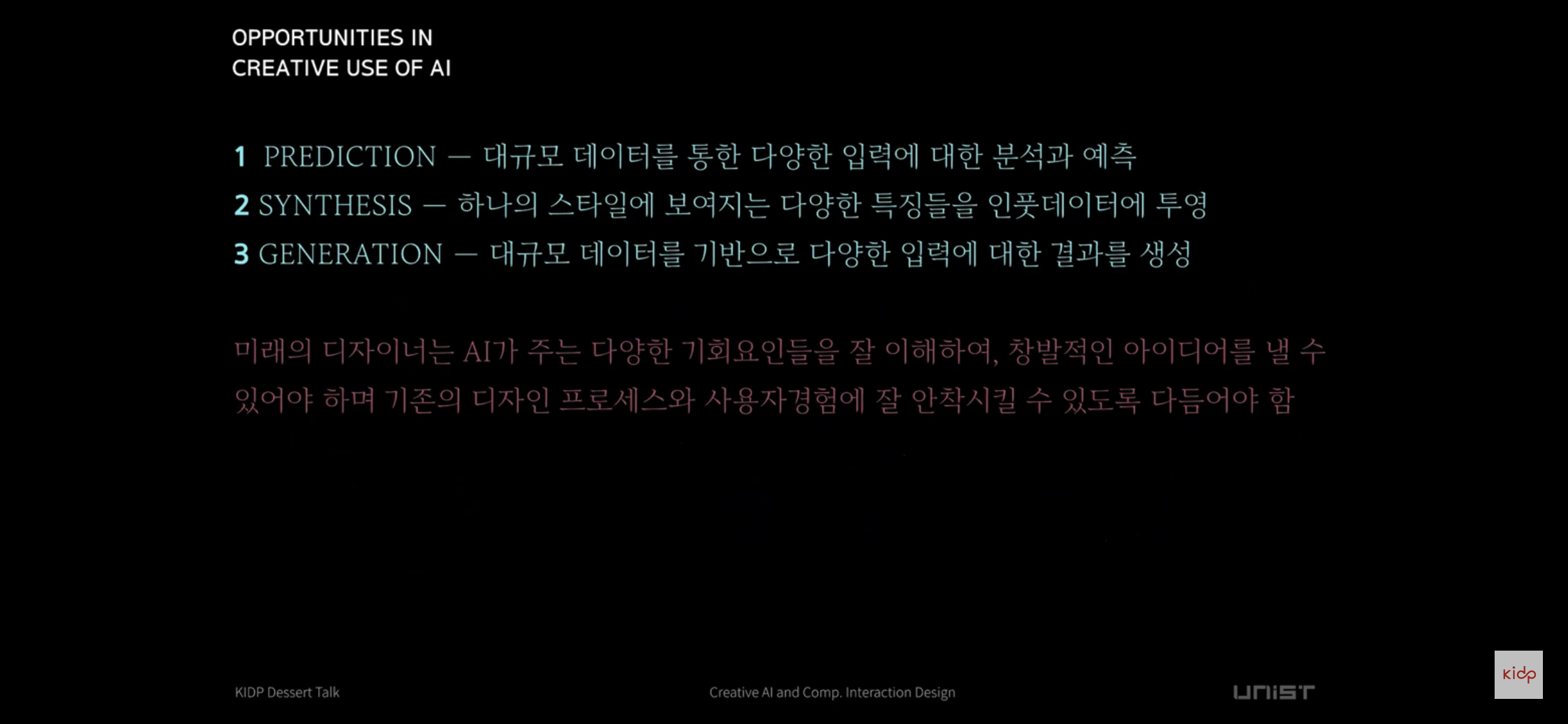 *미래의 디자이너는 AI가 주는 여러가지 환경을 이해하며 다양한 아이디어를 낼수 있어야 하고 기존의 디자인 프로세스인 사용자 경험에 잘 안착시킬수 있어야 한다. (사명감과 책임)
