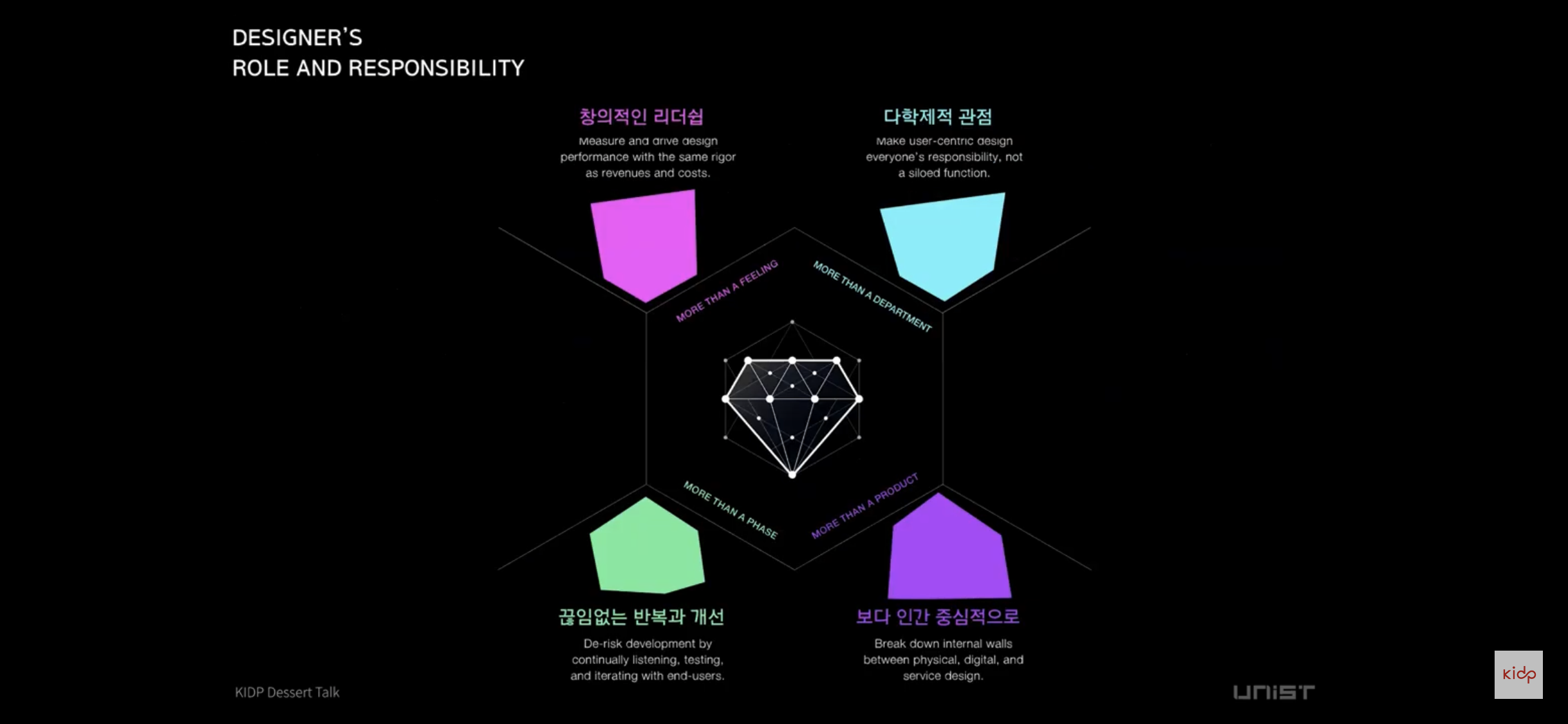 강연중느낀건, 디자이너가 엔지니어링파트도 엔지니어가 디자인파트도 알아야 하는 시대. 누구나 디자이너가 될수 있지만, 아무나 할수 없는 시대가 곧 올것이라는 느낌을 받았습니다. 그만큼 디자이너의 역할이 커지고 다른분야와의 경계도 모호해지겠죠.